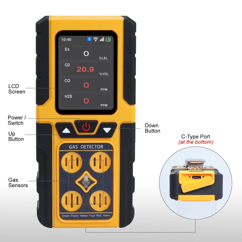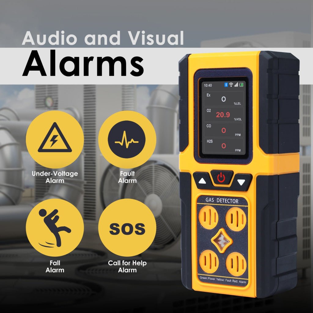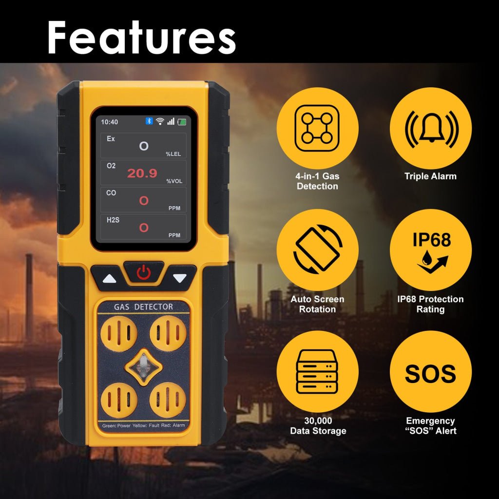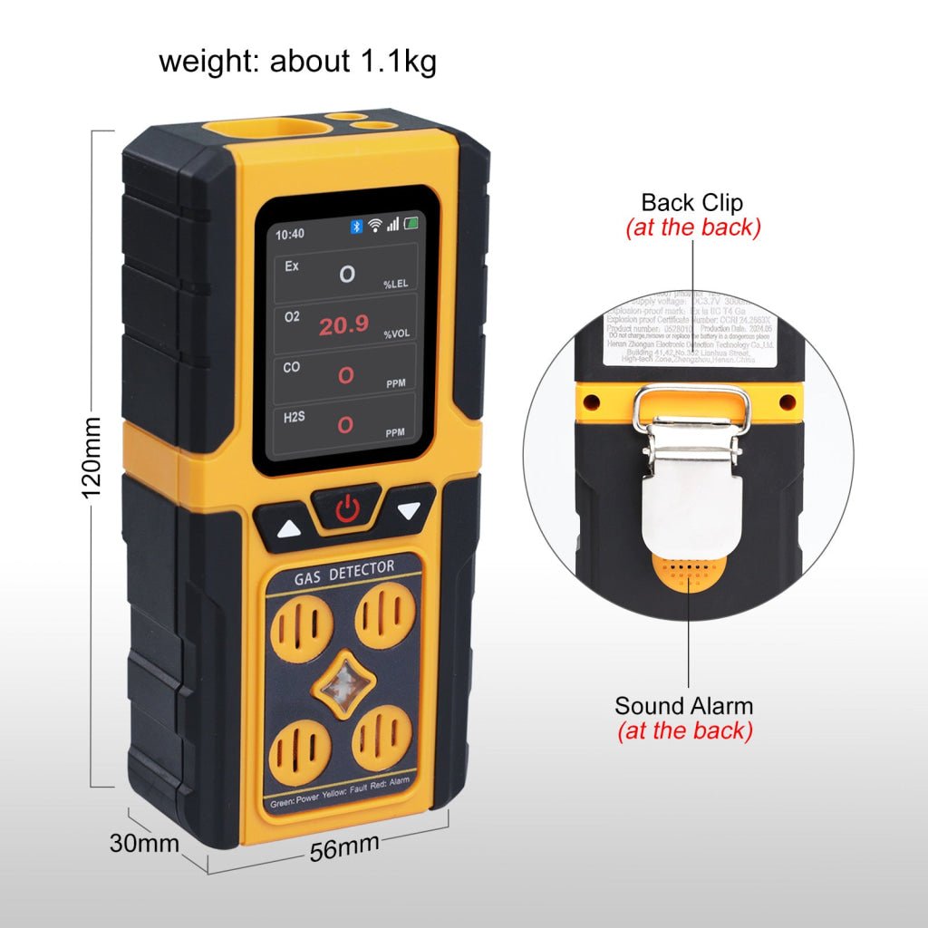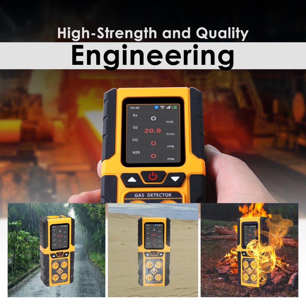 AQM - 434 AQM - 434 Gas Leak Detector 4 - in - 1 H2S|EX|O2|CO Tester Analyzer Instant Alerts Audible, Light, Vibration Alarm Natural Methane Gas Detector IP68 with Data Storage Portable Rechargeable - Gain Express