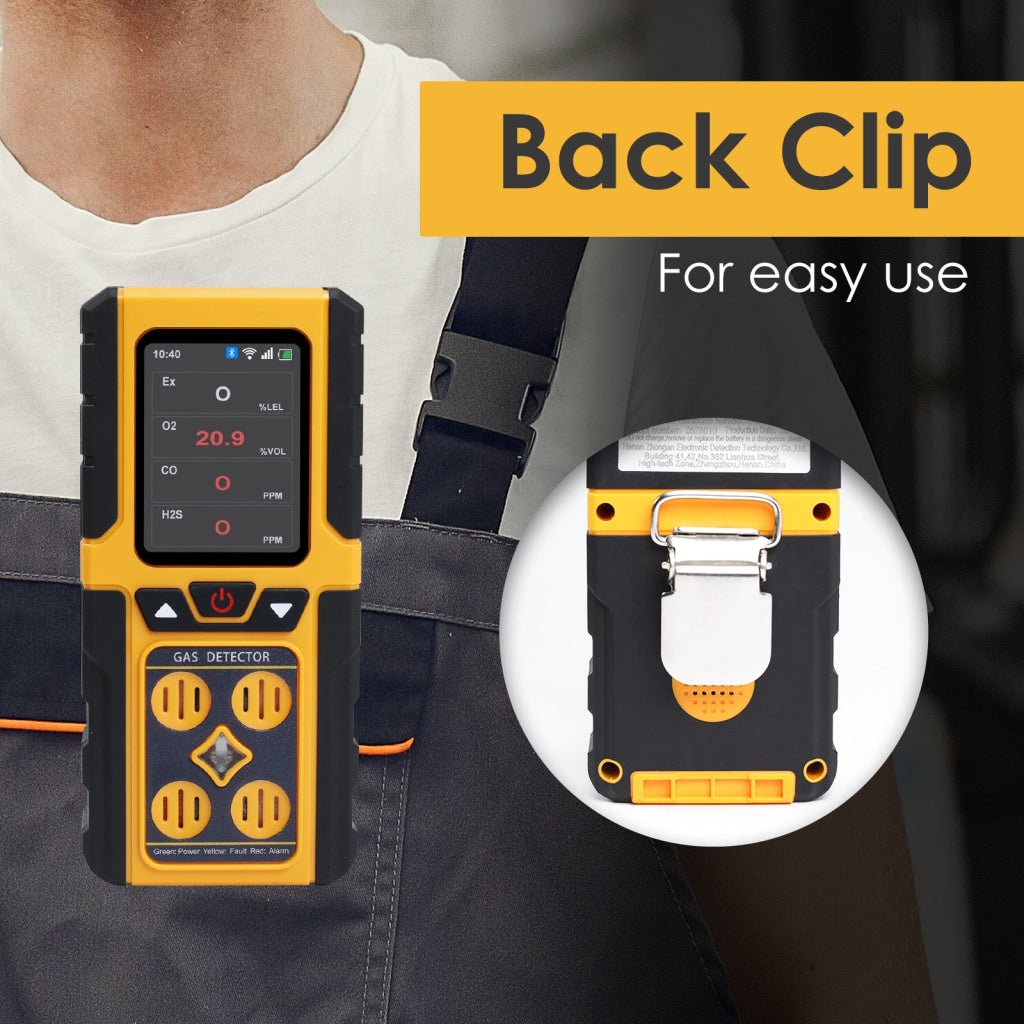 AQM-384 Portable Gas Detector CO H₂S O₂ EX (LEL) 4 Gas Detection Gas Rechargeable Clip Sniffer with Audible Visual Vibration Alert and Voice Prompt