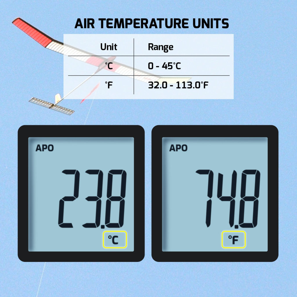 - Switchable units (m/s, km/h, ft/m, mile/h, knots)