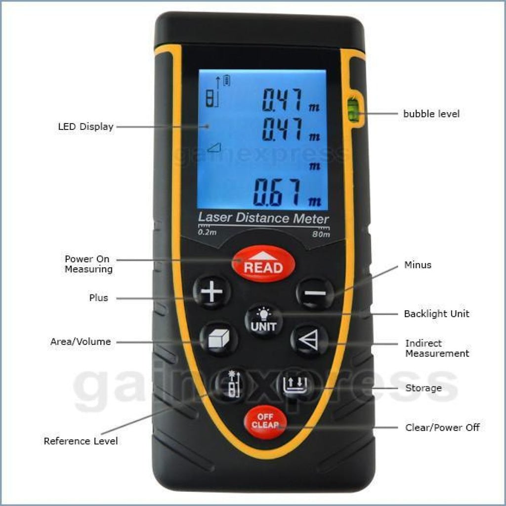 Professional Distance Meter make use of laser technology to measure distance,area and volumeaccurately,quickly and conveniently. This meter make use of Pythagorean Theorem to measure distance or lengths indirectly when direct measurement is not feasible.It can measure up to 80m (262ft) andexceptionally high accuracy ±2mm.