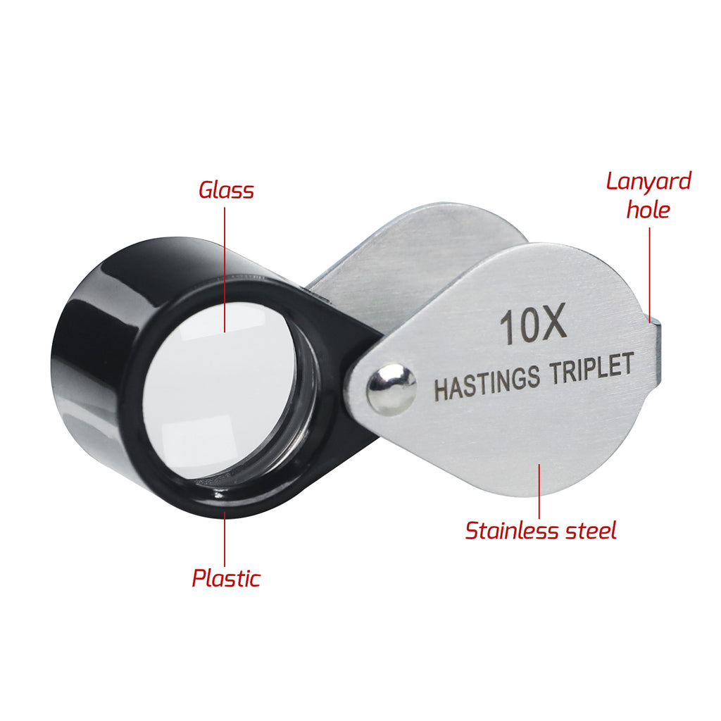 Enhance your precision work with our 10x Hasting Magnifier Mini Triplet Loupe. Crafted with an optical glass triplet lens and a durable stainless steel body, this foldaway pocket magnifying tool is a must-have for stamp & coin collectors, hobbyists, watches and circuit board repair mechanics.