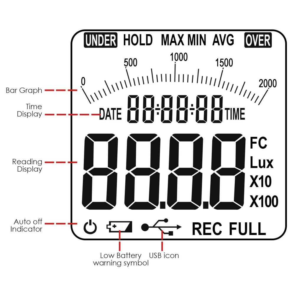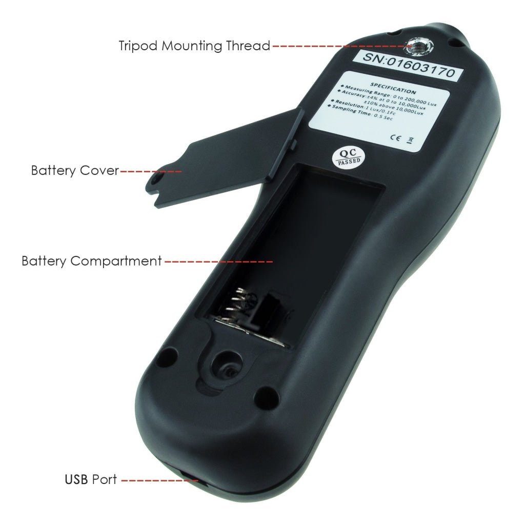 - Measure Range: 0 ~ 200,000 Lux ( 0.1 ~ 18,581 Fc) switchable
