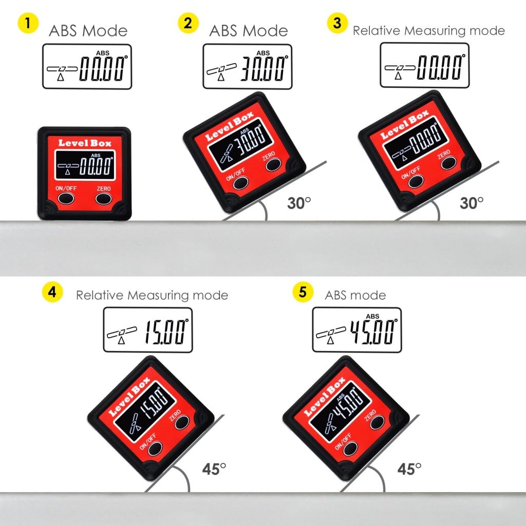 Highly accurate level box or "angle finder cubes" provides absolute and relative measurements, including the ability to zero set to any position. It has a magnetic base that can be attached to the work surface area that is going to be measured.