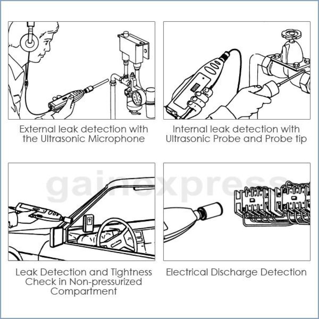 It is very suitable for detecting cracks of pipes, valves, and etc, and is very suitable for tightness check for cabin, plane, vehicle cabinet, refrigerator, freezing plant, oil tank and other sealed compartments; in addition, it can be use to detect electrical discharge from switches, transformers, insulators, circuit breakers, relay, bus bars and etc to prevent accidents.