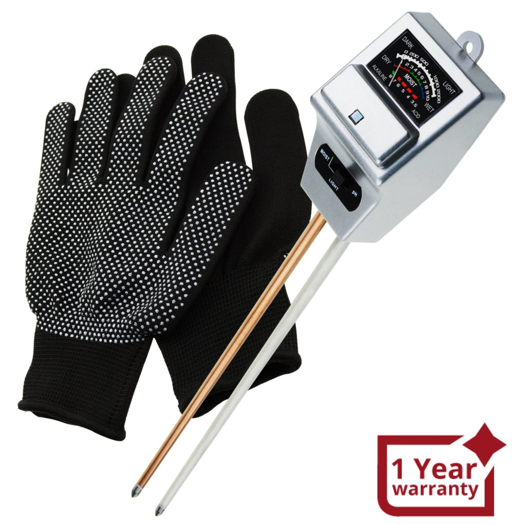 SQM-256_GLOVE Soil pH, Moisture & Light Meter 3 Way Tester Kit (Silver or Green with FREE Gloves), Gardening Acidity Probe Test Tool Plants Watering Quality Monitoring Checker for Garden Farm Lawn Household Indoor Outdoor