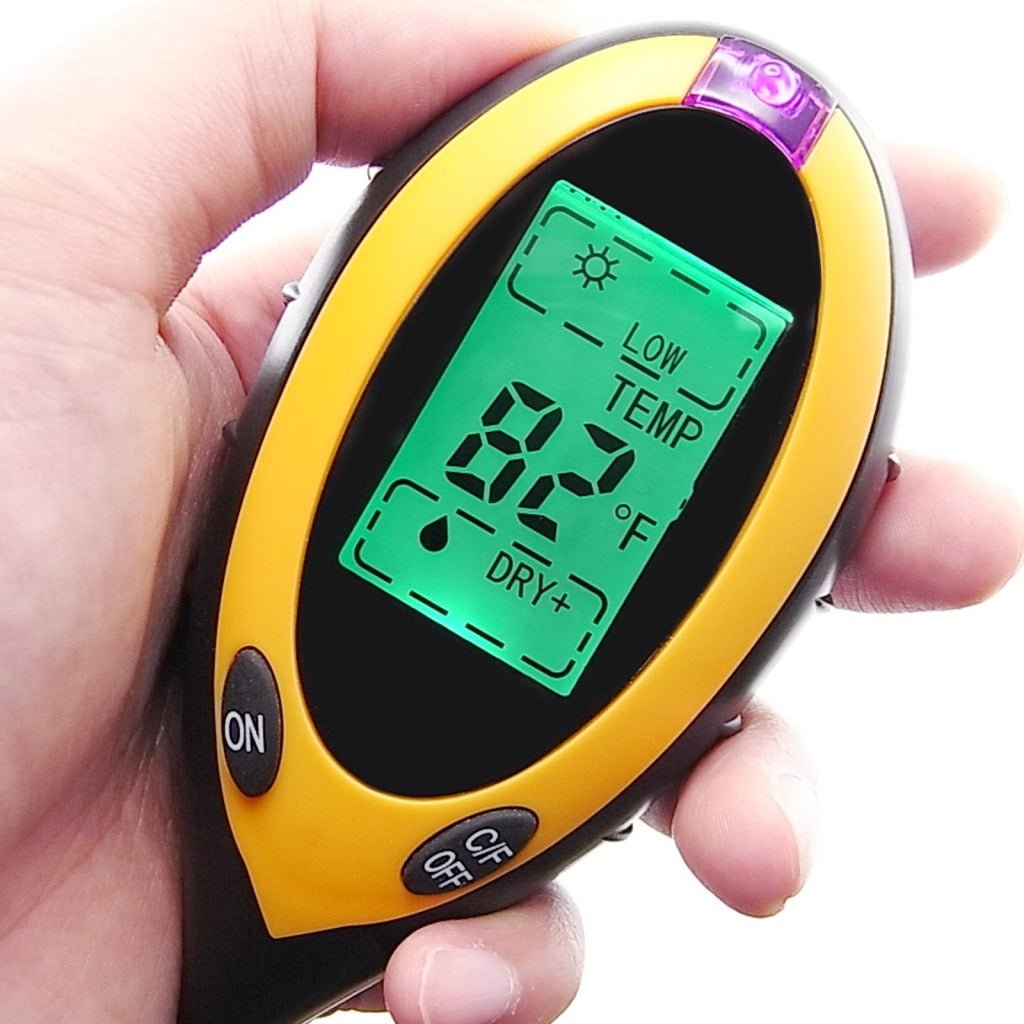 - Measures sunlight (9 levels), soil moisture (5 levels), soil pH (12 levels) and temperature (°C & °F)