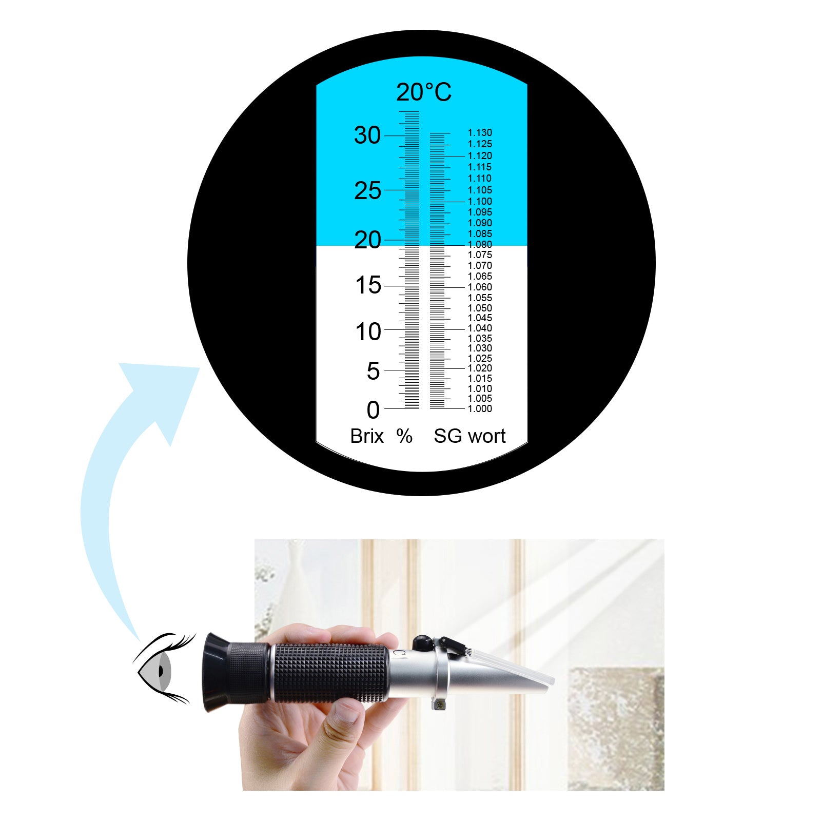 Optical Beer Refractometer measures refractive index of sample & displays result in brix & wort specific gravity. A tool like a hydrometer, measures specific gravity of beer or wort (brewing) or ferment for brandy.