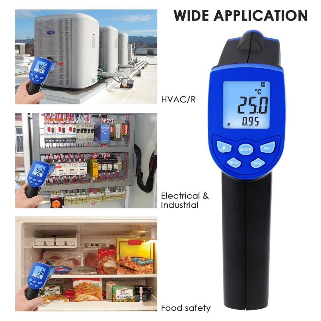 Compact, rugged and easy to use. Just aim and press the trigger, it will read the current surface temperature in less than a second. Safely measure hot, hazardous or hard-to-reach surfaces or object without contact. Widely use in equipment and examination of steel, glass, cement production process temperature.
