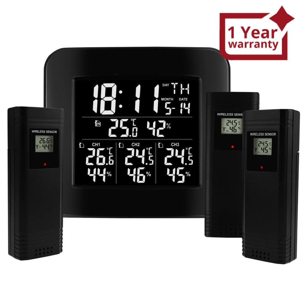 - WEA-288 Digital Wireless Weather Station Indoor Outdoor Temperature and Humidity Measure Hygrometer 3 Sensor, °C/°F Black LED Light Display, Alarm Clock Function WEA-288 Digital Wireless Weather Station Indoor Outdoor Temperature and Humidity Measure Hygrometer 3 Sensor, °C/°F Black LED Light Display, Alarm Clock Function