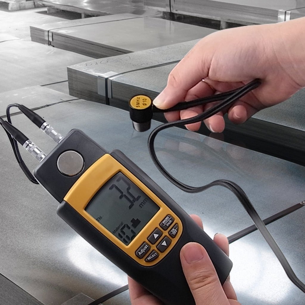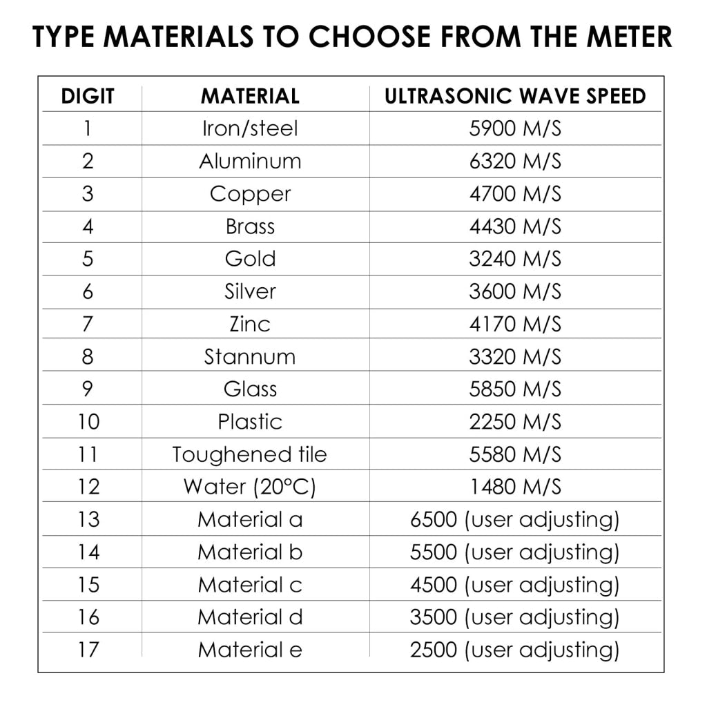 - Measuring thickness of various good ultrasonic wave conductors such as steel, aluminum, copper, glass, including iron, plastics, toughened tile, brass, gold, silver, zinc, water (at 20°C) and other materials.