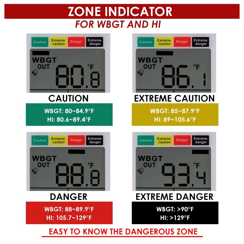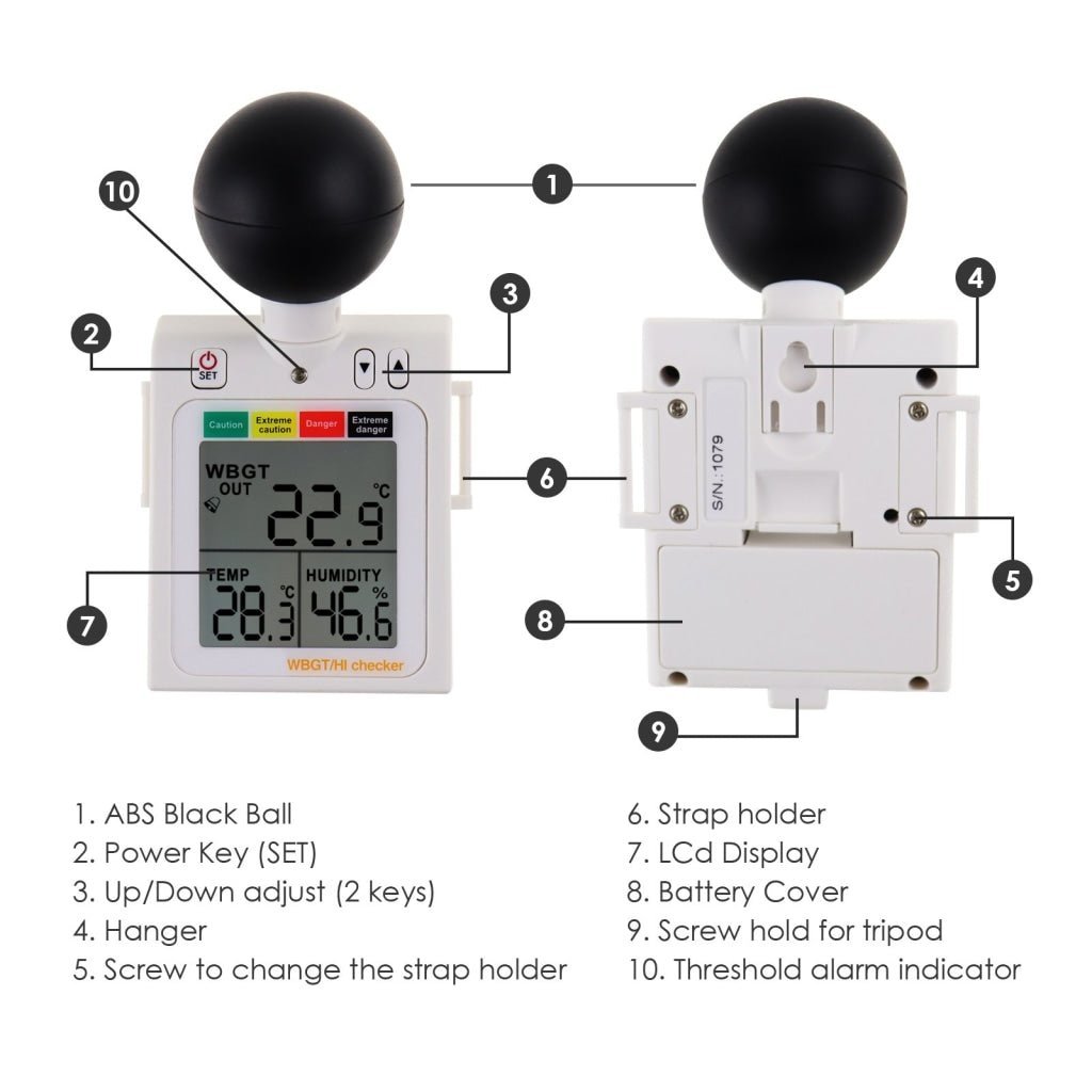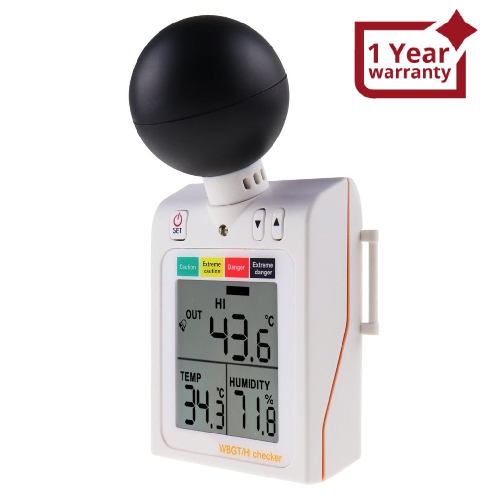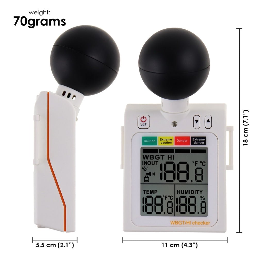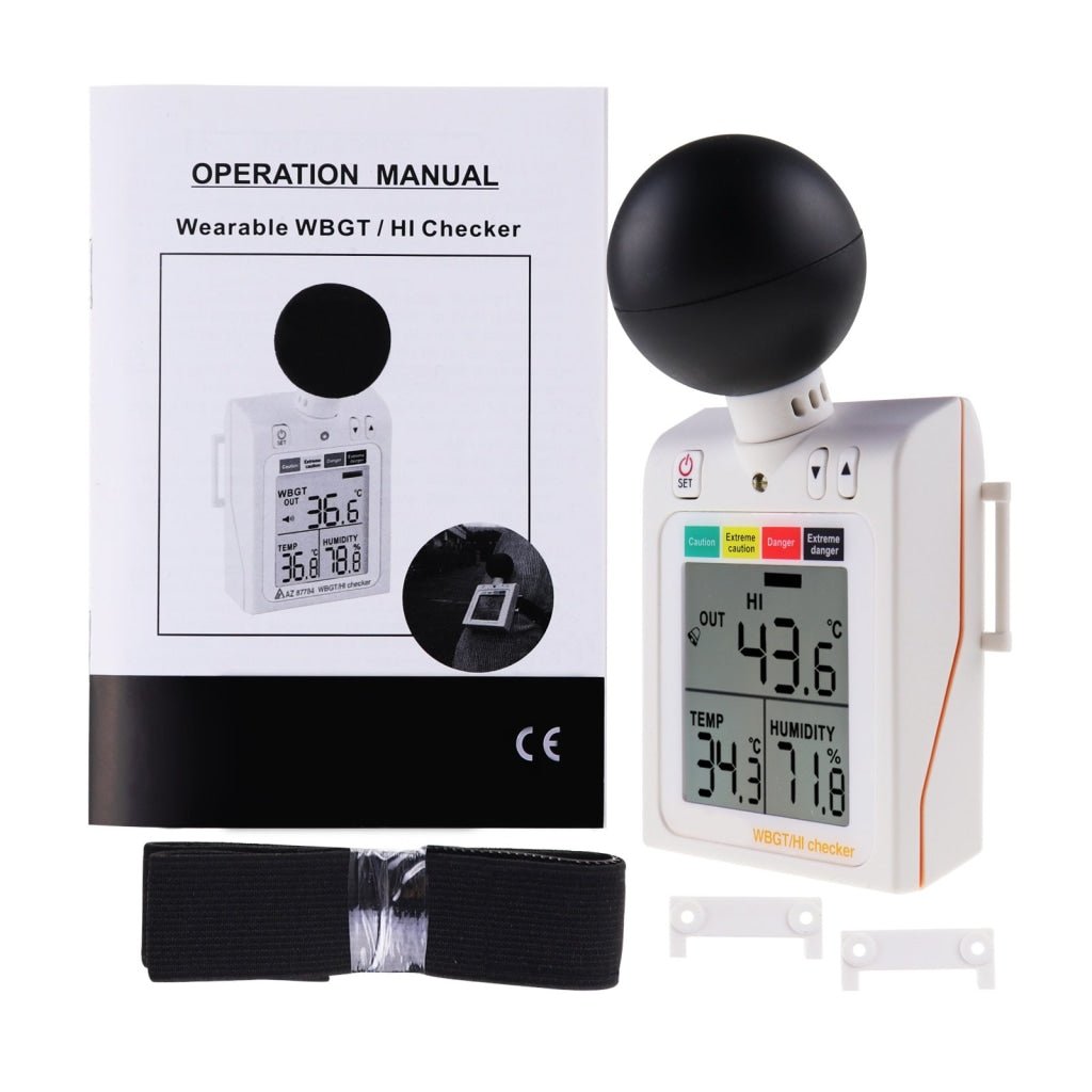 - 87784 Wearable 2-in-1 WBGT + HI Heat Index Checker Wet Bulb Globe Temperature Heat Stress Meter Air Globe Temperature Humidity Tester with Dangerous Level Indicator Audible Alarm 87784 Wearable 2-in-1 WBGT + HI Heat Index Checker Wet Bulb Globe Temperature Heat Stress Meter Air Globe Temperature Humidity Tester with Dangerous Level Indicator Audible Alarm