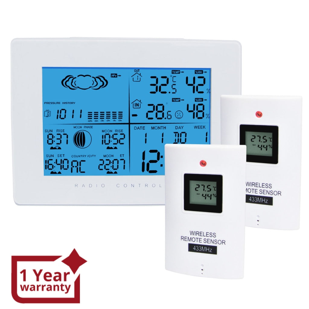 - AOK-5019_2S Weather Station with 2 Wireless Sensors, with Time, Barometer Weather Forecast, Temperature, Humidity, Sunrise/ Sunset/ Moonrise/ Moonset, Date, Alarm & Snooze, Radio Controlled Clock RCC DST, 12/ 24-hour format, Indoor & Outdoor AOK-5019_2S Weather Station with 2 Wireless Sensors, with Time, Barometer Weather Forecast, Temperature, Humidity, Sunrise/ Sunset/ Moonrise/ Moonset, Date, Alarm & Snooze, Radio Controlled Clock RCC DST, 12/ 24-hour format, Indoor & Outdoor