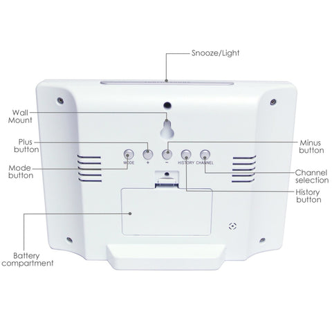 - Six Buttons: Mode, plus (+), minus (-), History, Channel, Snooze/light
