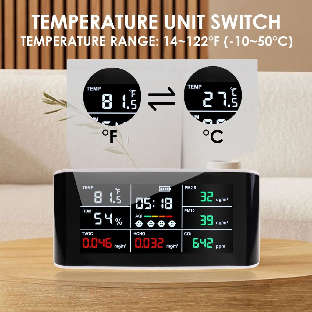 - Multifunctional air quality detection: :Carbon dioxide (CO2), PM2.5/PM10, HCHO, TVOC, AQI, temperature, humidity