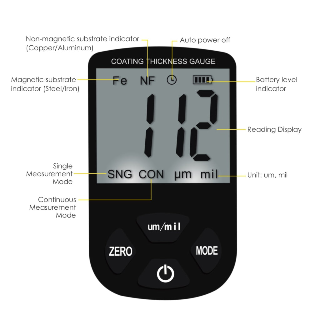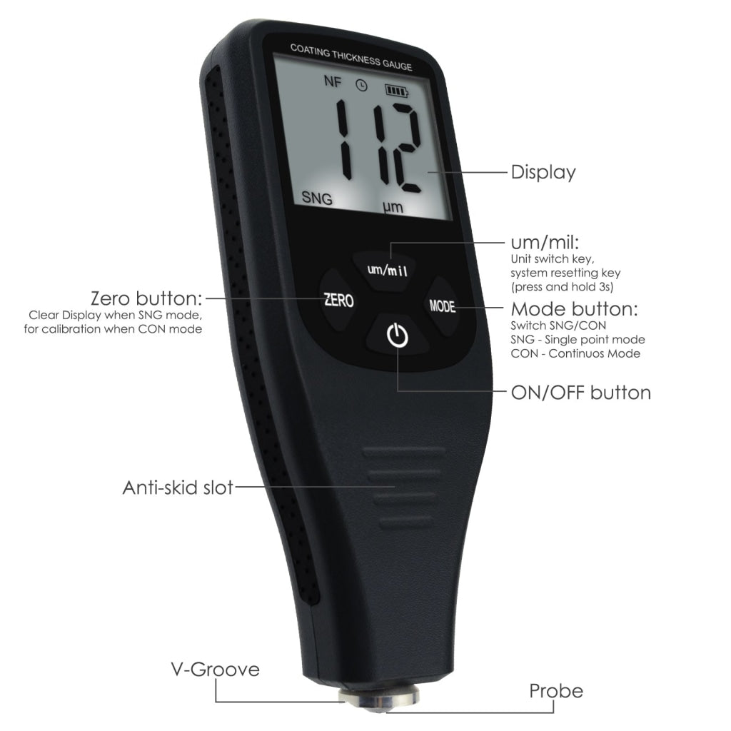 This thickness gauge is used to measure the thickness of the plated and coated sheet on metal like paint/enamel/chrome on steel, paint and anodizing coating on aluminum / copper.