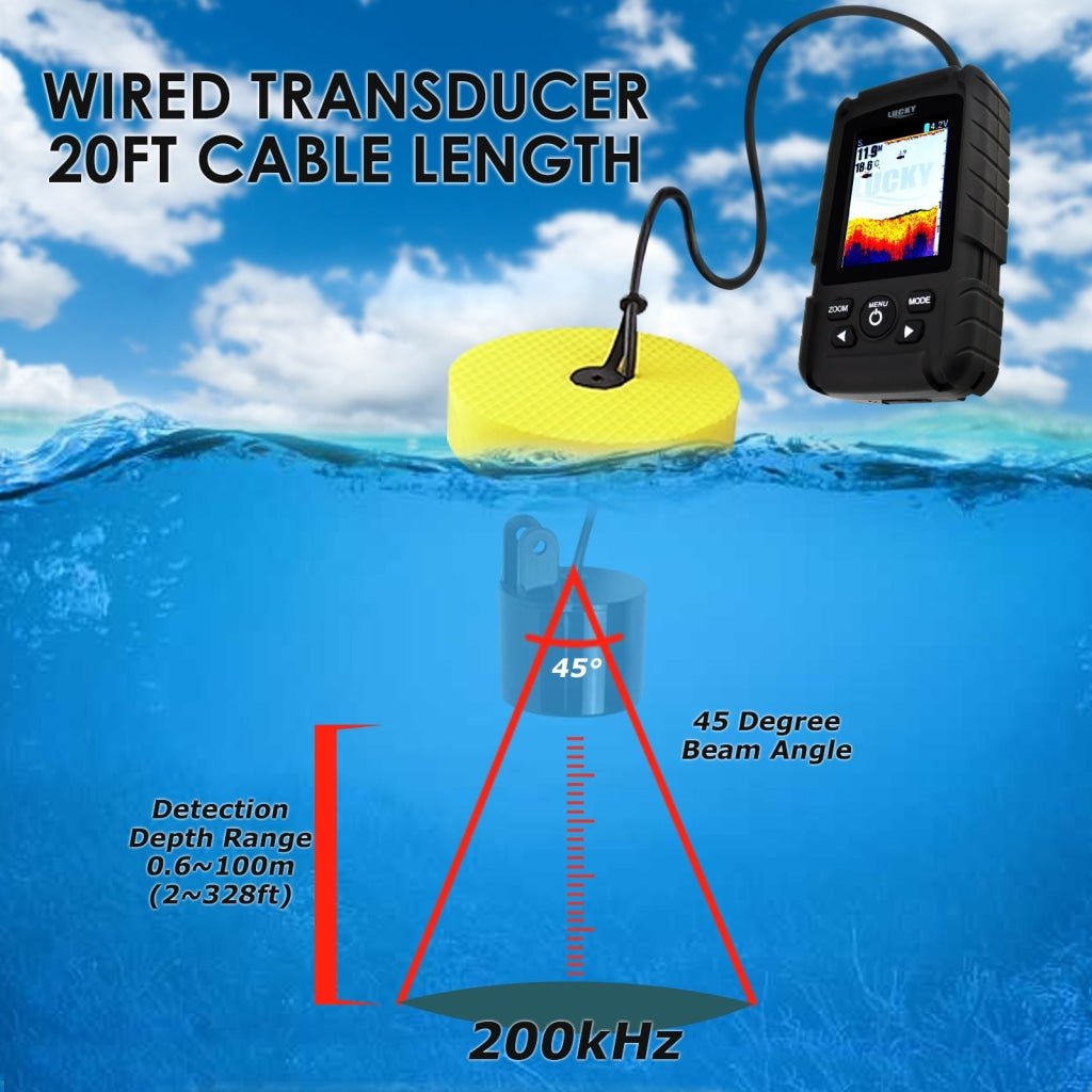 This Fish finder has 2 user mode: Transducer Mode- can indicate fish found in 45° beam angle and Wireless Mode - can indicate fish found in 90° beam angle.