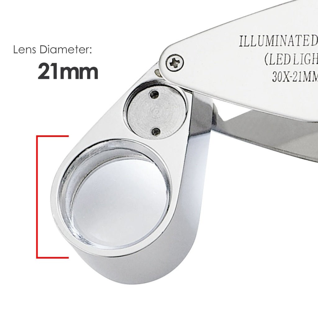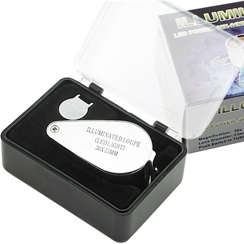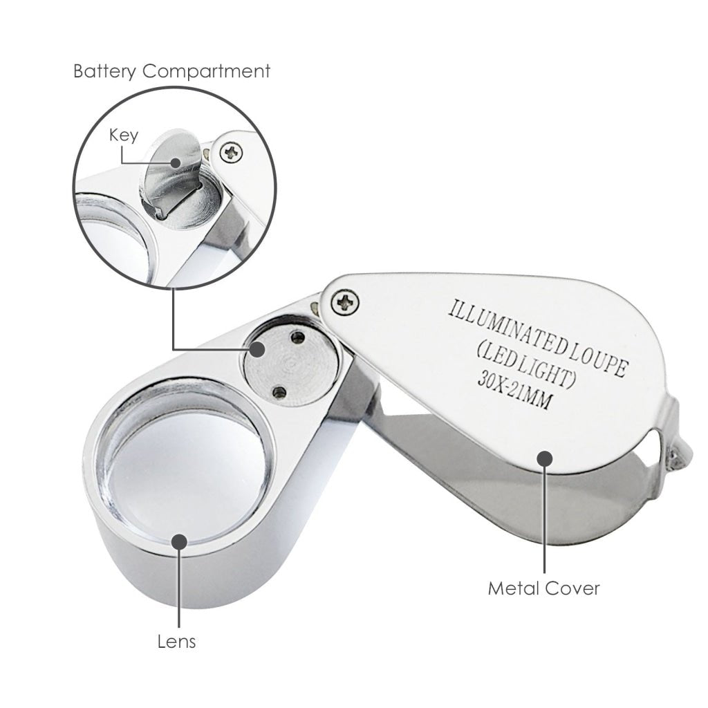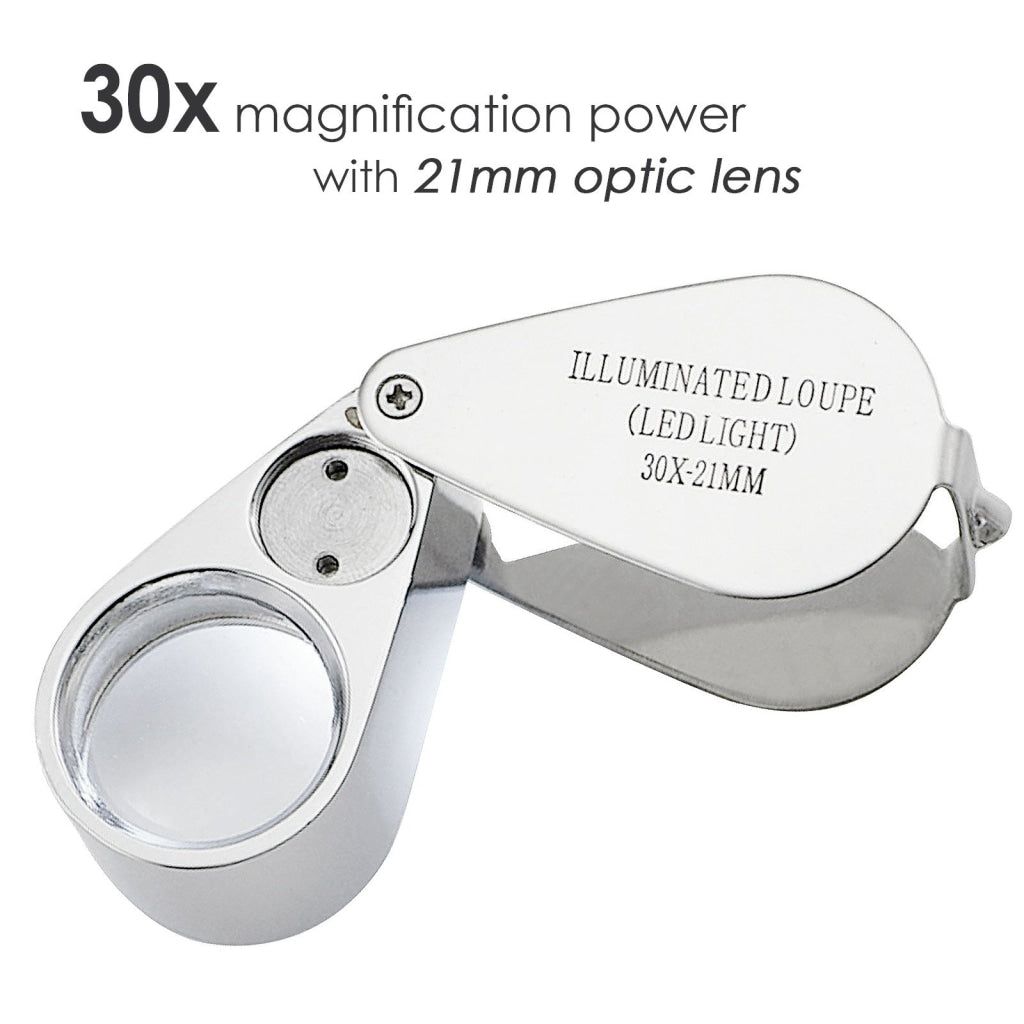 Ideal for use in poor lighting conditions. It offers 30 times magnification power for extra sharpness and clarity in a 21mm colorless optical glass lens, built-in bright LED Light source activated by a push of a button switch. This battery operated loupe has an easy slide switch that can be switch ON or OFF, storage case to protect the loupe while not in use, and a key for opening & closing battery compartment.