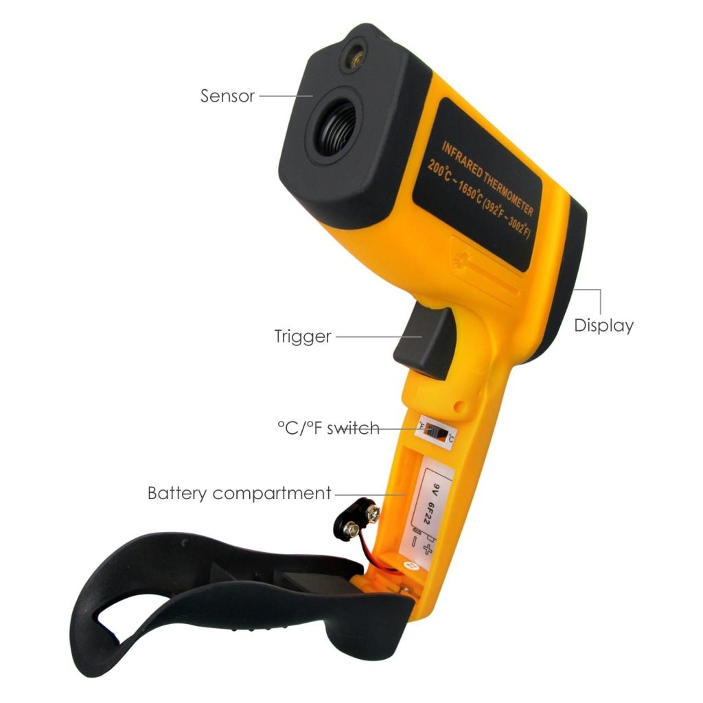 This Professional Digital Infrared Thermometer is compact and easy to use. It is a very useful item for measuring surface of hot, hazardous or hard to reach objects without having to touch them. You just aim with Laser Point, press the button, and read the temperature in less than a second.