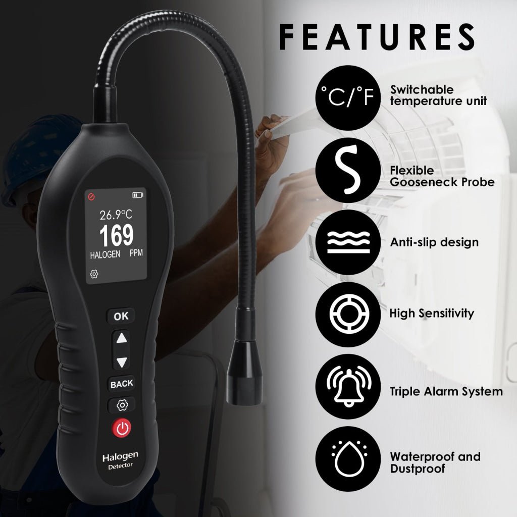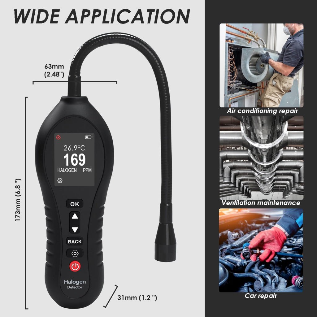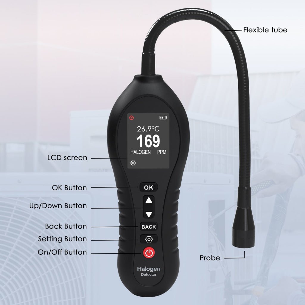 - LKD-431 Halogen Gas Leak Detector High Sensitivity for Air Conditioning Repair, Car Repair, Gas Pipelines, Industrial Plant, Home Use with 10.5-inch Gooseneck Probe Visual, Audible and Vibration Alert LKD-431 Halogen Gas Leak Detector High Sensitivity for Air Conditioning Repair, Car Repair, Gas Pipelines, Industrial Plant, Home Use with 10.5-inch Gooseneck Probe Visual, Audible and Vibration Alert