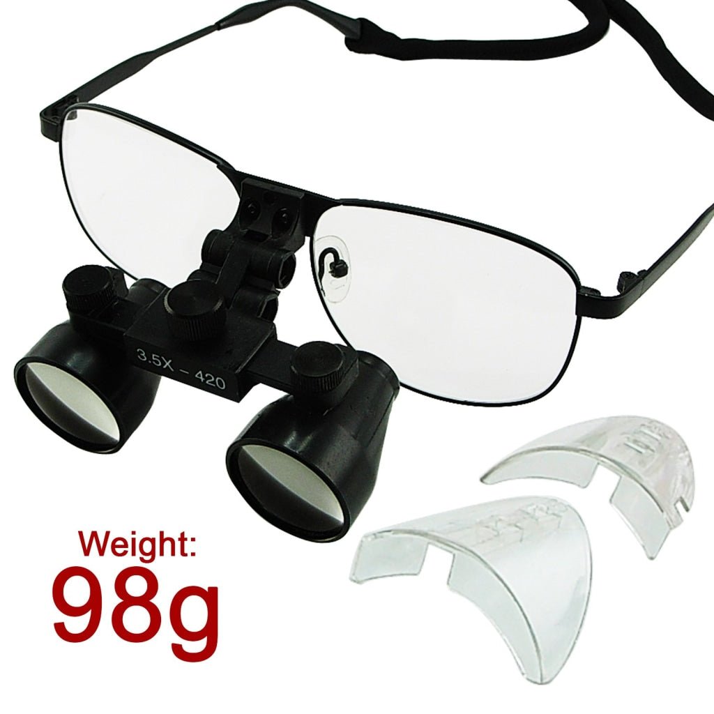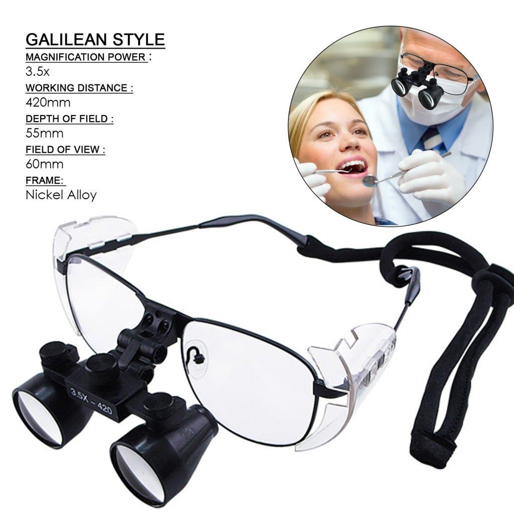 This 3.5x Galilean style loupe offers a wide field of view and generous depth of field with high enough magnification for daily dental procedures. Mounted on a lightweight, high strength and heavy duty nickel alloy frame. It has a specially coated precision lenses for the optimal amount of light transmission into your eye to provide excellent clarity and reduce light reflection to avoid eye strain, neck pains or backache. These loupes are designed with high resolution and proper focal length. The frames of the loupes are made durable and fit the wearer properly.