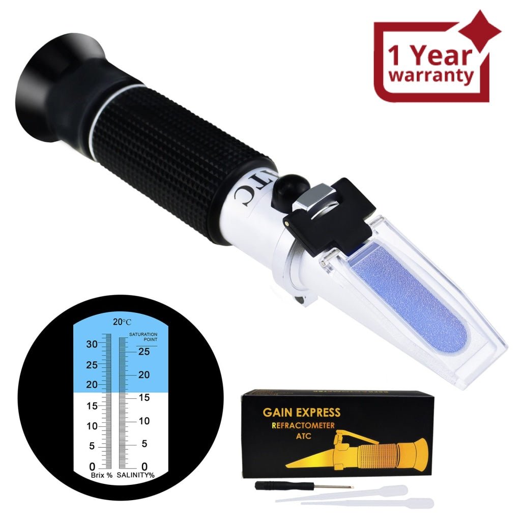 - REBS-28ATC 2-in-1 Brix Salinity Refractometer Dual Scale 0-32% Brix & 0-28% Salinity with ATC Sodium Chloride in Food Salt Seawater Brine Beer fruits Cutting Liquid REBS-28ATC 2-in-1 Brix Salinity Refractometer Dual Scale 0-32% Brix & 0-28% Salinity with ATC Sodium Chloride in Food Salt Seawater Brine Beer fruits Cutting Liquid