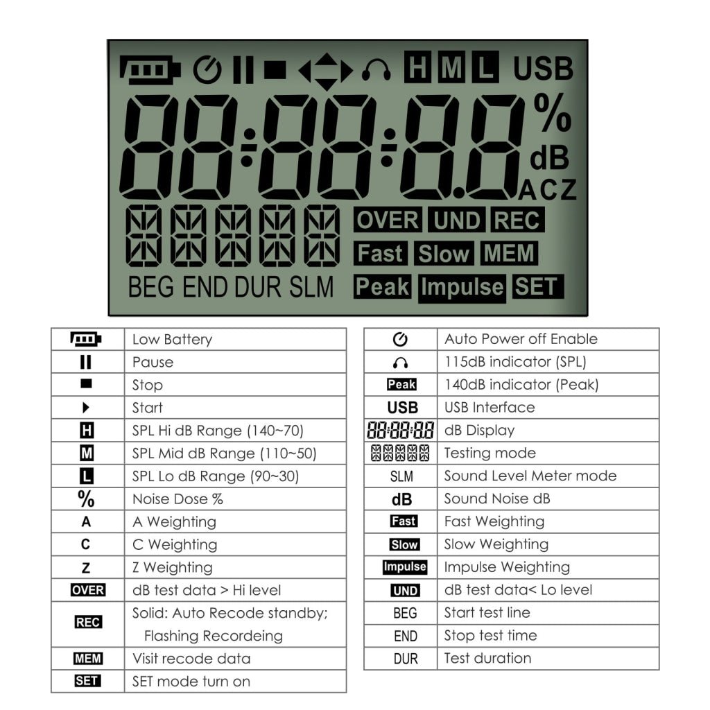 - Measurement Range: 30dB~140dB (A) / 35dB~140dB (C) / 40dB~140dB (Z)