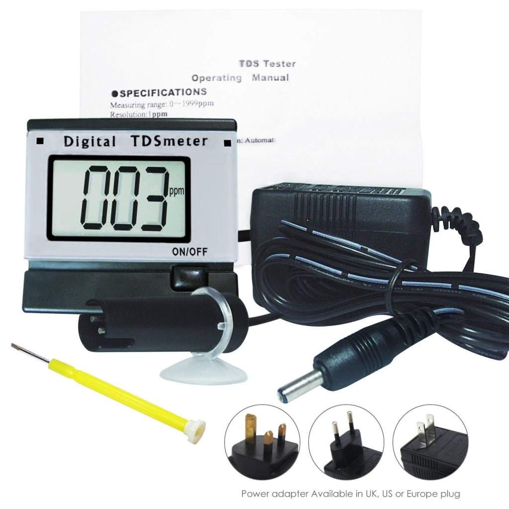 The NEW METER is a less expensive, slick and stylish handy meter that comes with a large and easy to read display system. A cable from meter to sensor and an easy operation-switch-button are provided for easy installation and usage. A mini-screw driver (trimmer) is supplied for easy calibration of the Digital TDS Meter plus it comes with plug adapters that works in Europe, UK and USA so you can just plug your power charger straight into the wall. Also included are four (4) FREE 1.5V batteries for less hanging wires in you aquarium area.