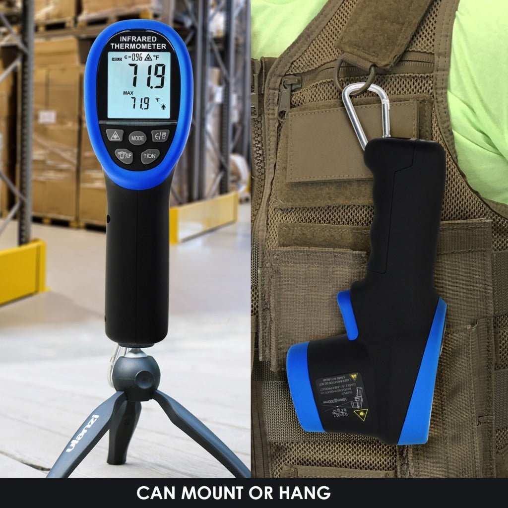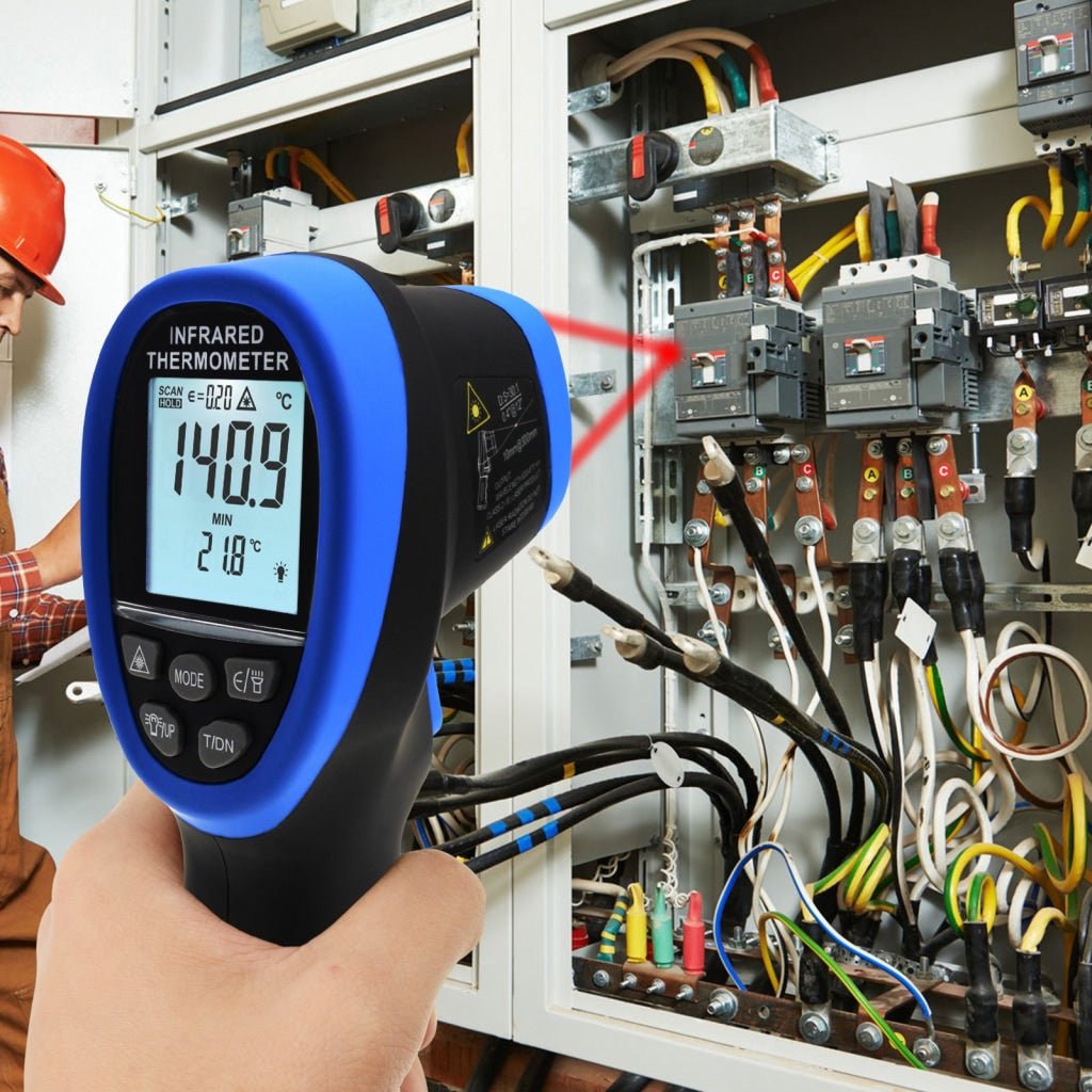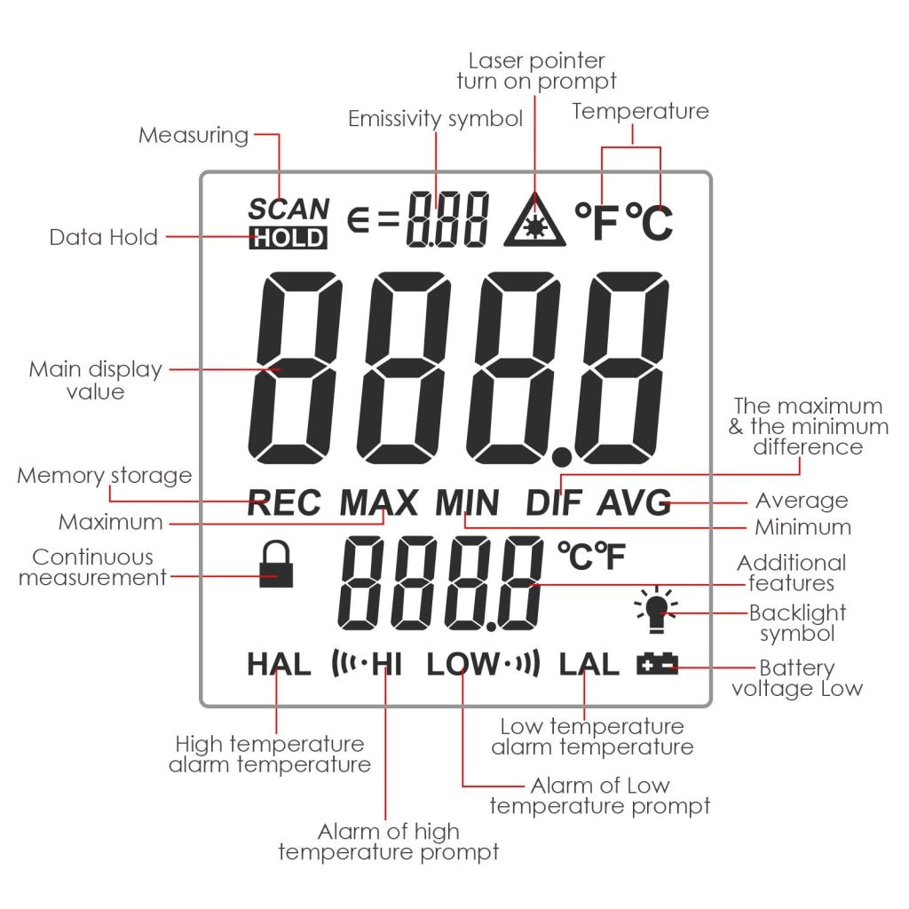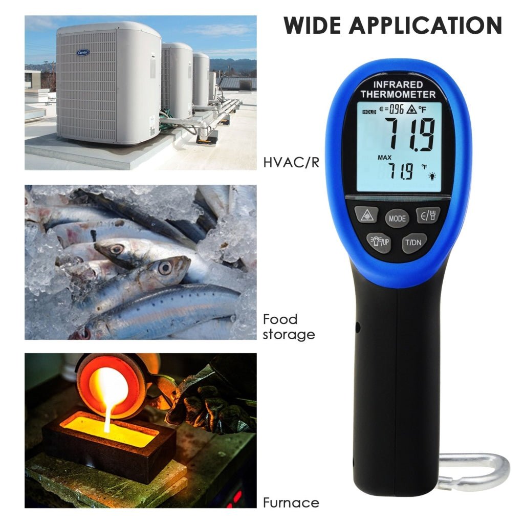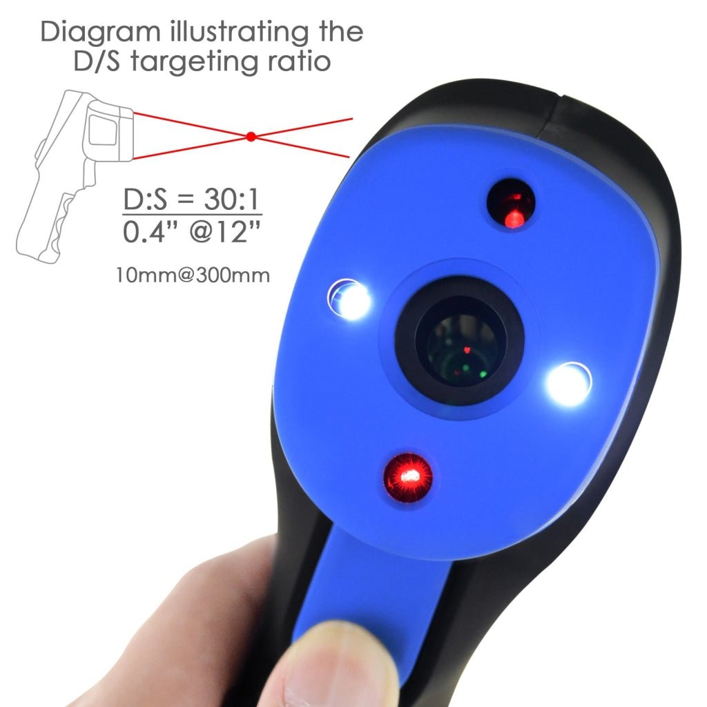 Compact, rugged, easy to use and measures target surface temperature range of -50~1500°C/-58~2732°F with 30:1 distance spot ratio. Just aim, press the trigger and read current surface temperature in less than a second. Safely measure hot, hazardous or hard-to-reach surfaces or object without contact. Widely used in equipment and examination of steel, glass, cement production process temperature.