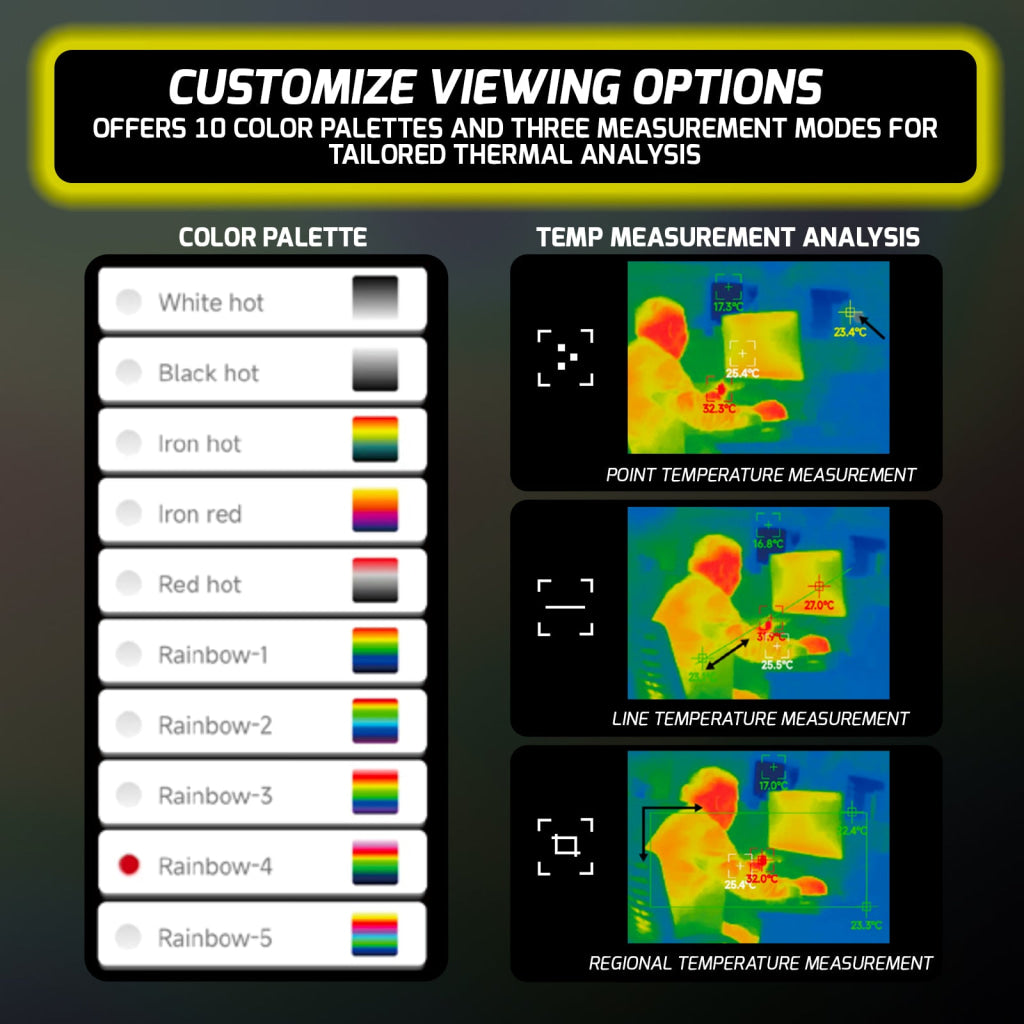 - 10 Palettes: white hot, black hot, iron hot, iron red,red hot, rainbow - 1,rainbow - 2,rainbow - 3, rainbow - 4, rainbow - 5
