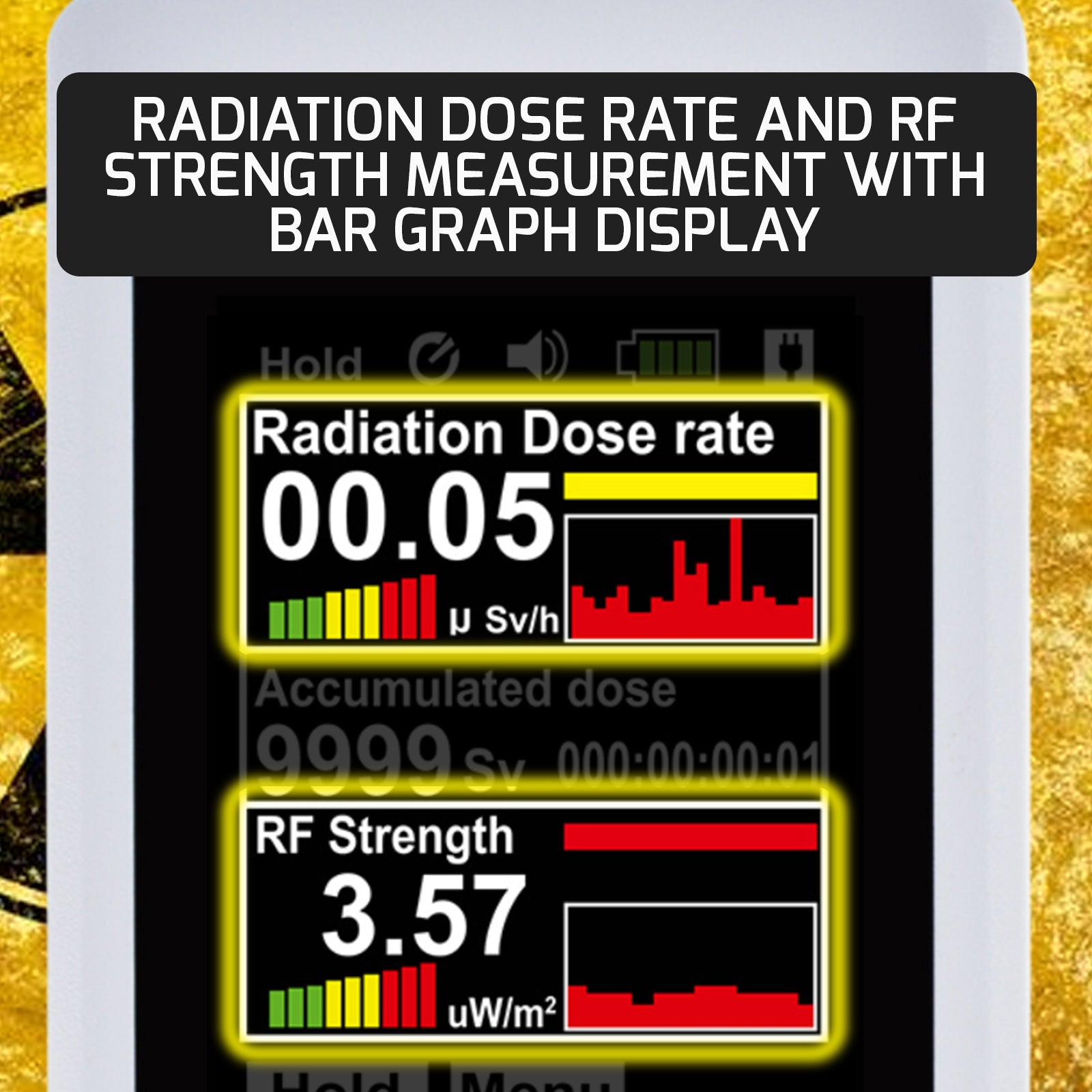 • Radiation dose rate and RF strength measurement with bar graph display