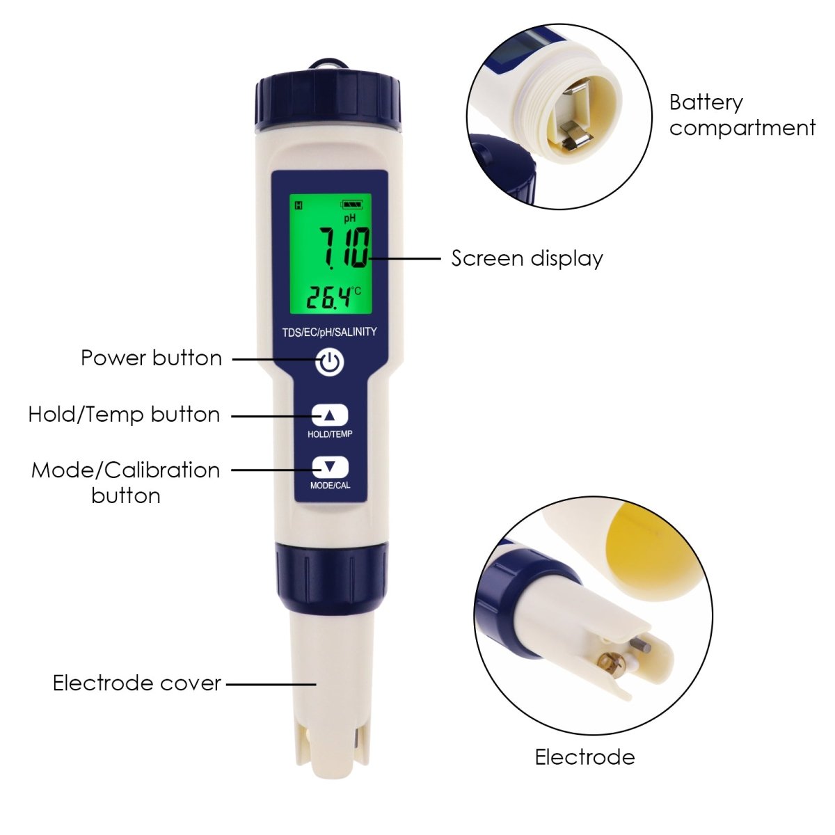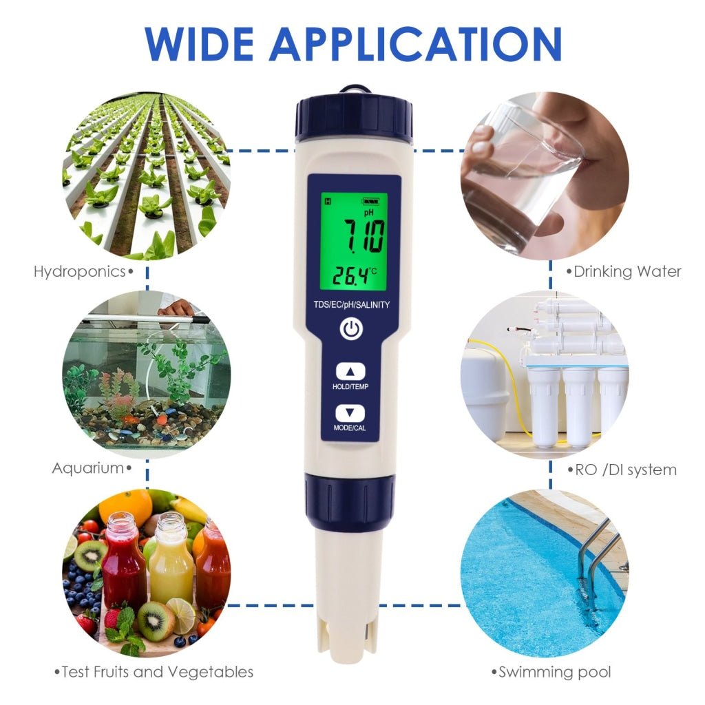 This 5-in-1 water quality tester is an ideal tool for many type of water analysis all in one handy instrument. It has the following parameters.