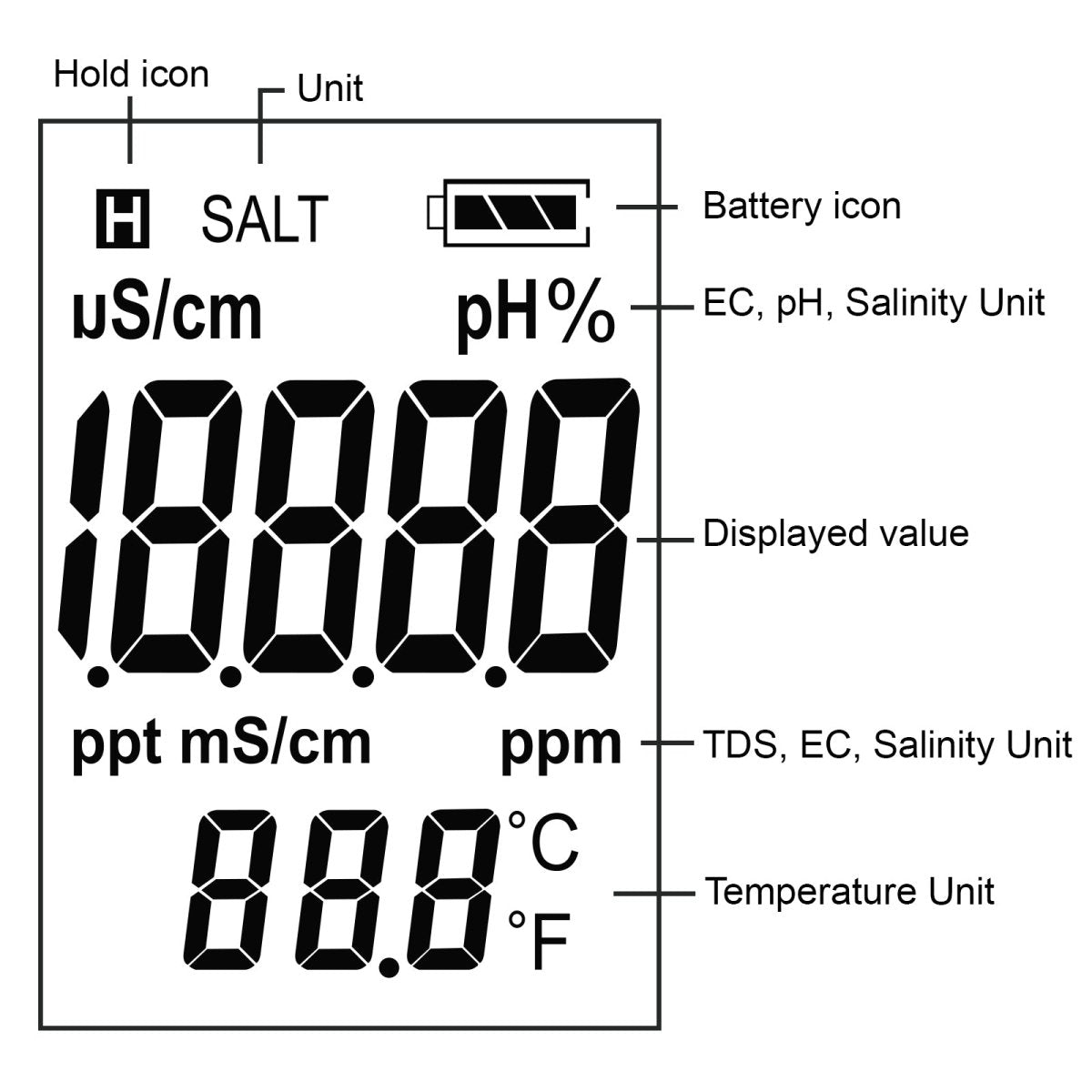 • TDS: 0~10000ppm, 10.1~200.0ppt (convert range automatically); 1ppm or 0.1ppt resolution; ±2% F.S. accuracy